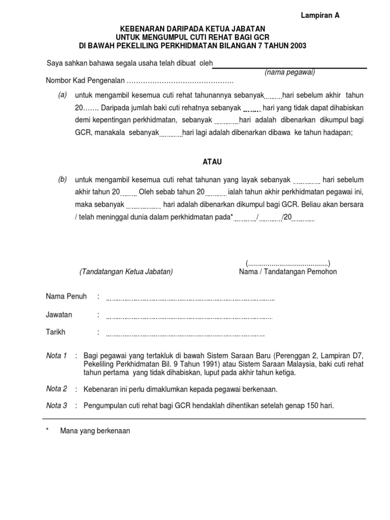 Lampiran A Kebenaran Daripada Ketua Jabatan Untuk Gcr Pdf Pekeliling Perkhidmatan Bil 9 Tahun Pdf Document from demo.fdokumen.site Penjumudan skim perkhidmatan juruteknik dan pindaan skim perkhidmatan pelukis pelan, penolong jurutera, penolong pegawai seni bina dan penolong juruukur bahan. Pekeliling ini menggantikan pkpa bil. Pkpa bil.07/1991 pekeliling panduan mengenai kumpulan meningkat mutu kerja (kmk). Surat pekeliling perkhidmatan bilangan 1 tahun 2006 jpa. Kuatkuasa pelaksanaan pemakaian pekeliling perkhidmatan bil. Dasar dan prosedur penempatan pegawai di bawah program penempatan silang (cross fertilization program). Pekeliling perkhidmatan bil 14 tahun 2008. Perintah am bab a arahan perbendaharaan surat pekeliling perkhidmatan bil.