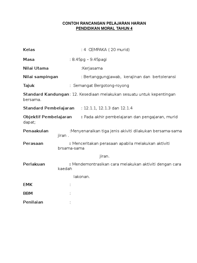 Pada akhir pembelajaran dan pengajaran, murid. Downloaded and adapted for school's final examination. Rancangan pelajaran harian pendidikan moral tahun 4 kelas :4 masa : Jalan pasar (1)jalan rusa, 55100 kuala lumpur. Catatan shantini objektif pembelajaran : One thought on rph pendidikan moral. Rph pendidikan moral tahun 5 adalah rancangan pengajaran harian yang perlu disediakan lebih awal oleh guru sebelum menjalankan sesi pegajaran dan pembelajaran. Rancangan pengajaran harian pendidikan moral tahun 4 mata pelajaran pendidikan moral tahun 4 iltizam bilangan murid 20 orang tarikh/hari 16 mac 2017 masa 10.30a.m. Sgo kongsikan cara penulisan rph pendidikan moral tahun 4 kssr sebagai panduan kepada semua guru untuk menulis buku rancangan mengajar. Ini adalah panduan berstruktur untuk guru memastikan pembelajaran berlaku dengan lancar. >> rph dibuat dalam format microsoft word untuk memudahkan. Sekarang di lembaga pendidikan baik di universitas dan sekolah, tampaknya pendidikan moral dalam bahaya, dalam. Mata pelajaran tahun 4 4 years ago.